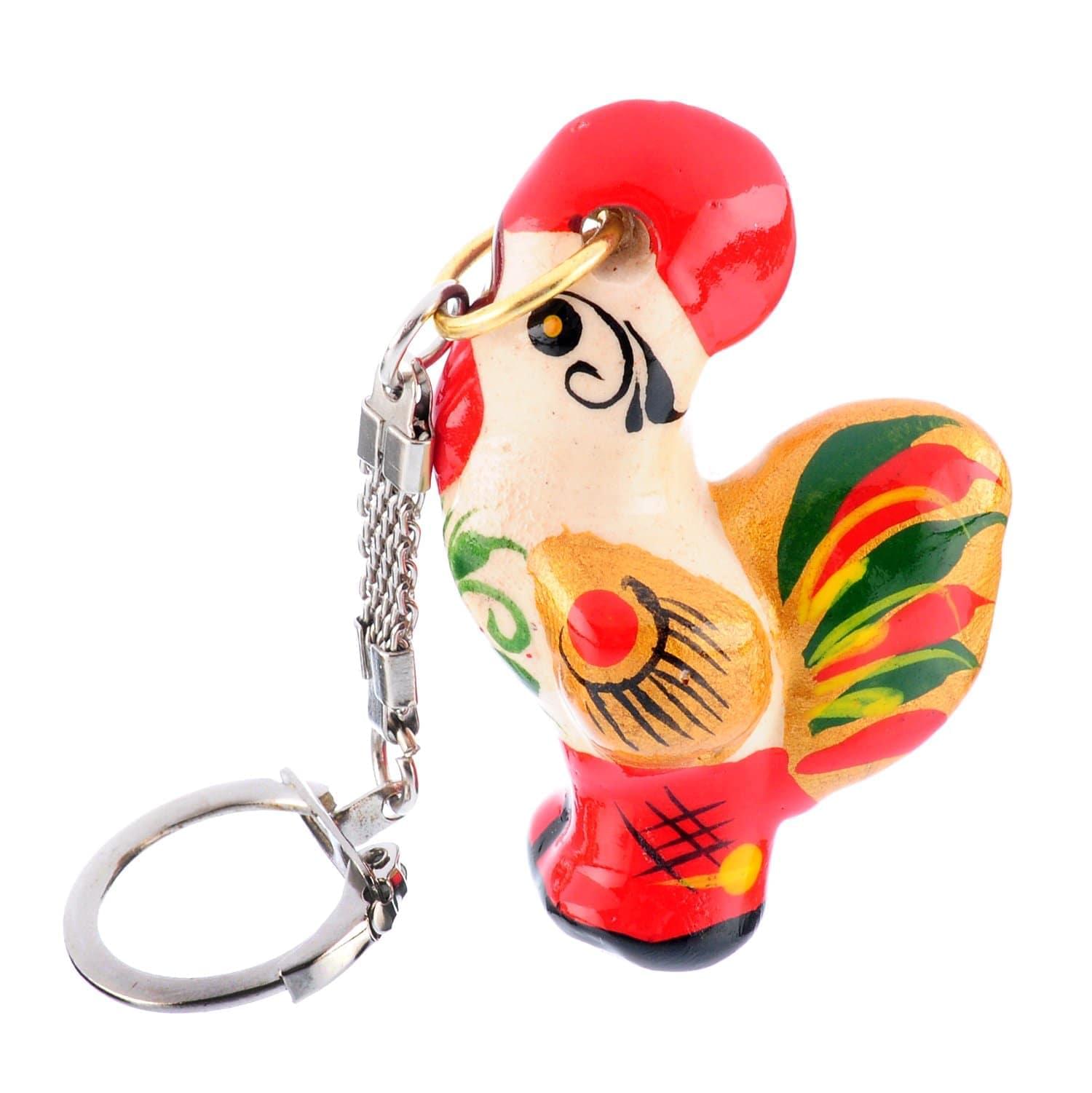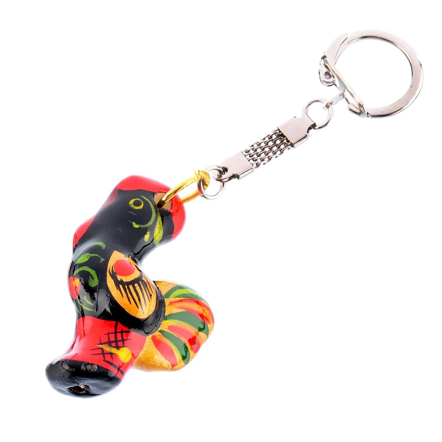 Аксессуар для украшения связки ключей, брелок с динамичной подвеской на цепочке с карабином в виде анималистической скульптуры петушка, символа солнца и возрождения. Скульптура малой формы изготовлена в селе под Нижним Новгородом из глины и расписана в техниках свободно-кистевой хохолмской росписи.