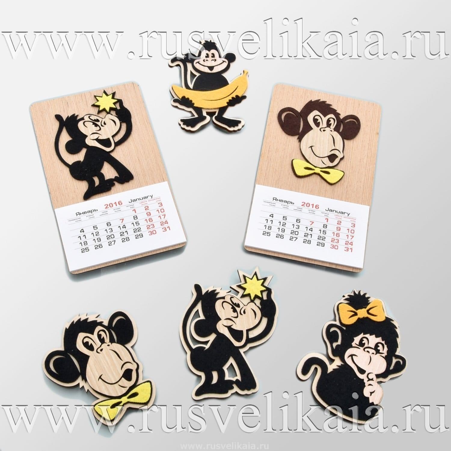 Поскольку не за горами Новый год, а он пройдет под эгидой Обезьяны, мы пополняем ассортимент сувенирами с изображением этого животного, предка человека. Перед Вами магнит в виде обезьяны и календарик-магнит, украшенный жизнерадостной мартышкой, которые оставят добрую память о дарителе и украсят холодильник. Корпус календаря сделан из дерева, а мартышка является тканевой аппликацией. Магнит