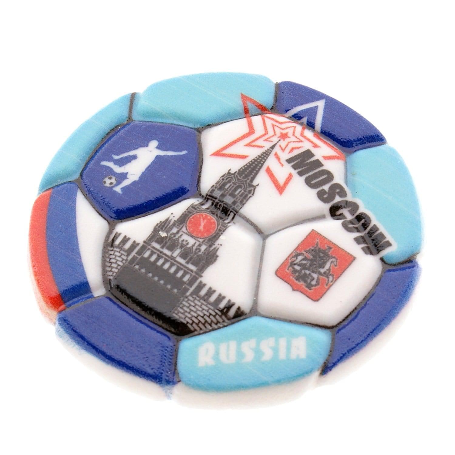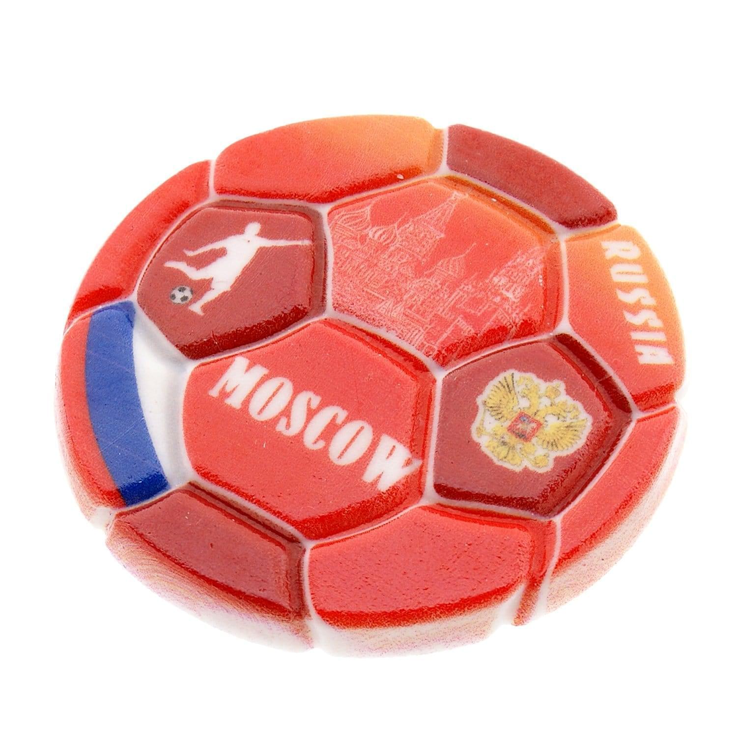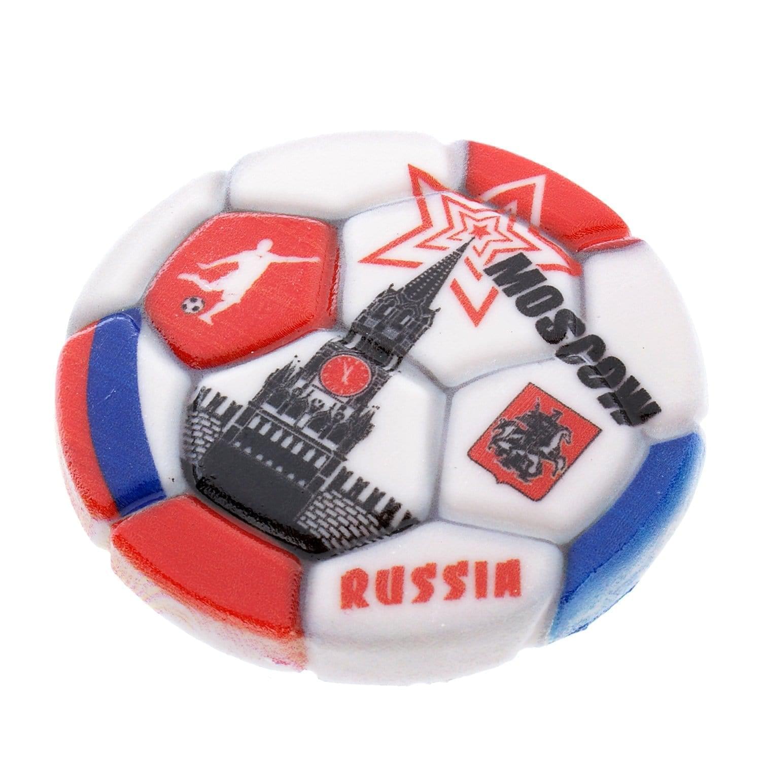 Магнит - ходовой сувенир. Этот яркий элемент декора создает яркий акцент на дверце холодильника и всегда напомнит о путешествии в любимое месте на Земле. Москва - город-мечта, в котором проходит главное спортивное событие 2018 года, Чемпионат мира по футболу. Магнит в виде футбольного мяча из искусственного камня полистоуна в красочной цветовой гамме - это сувенир то что надо.