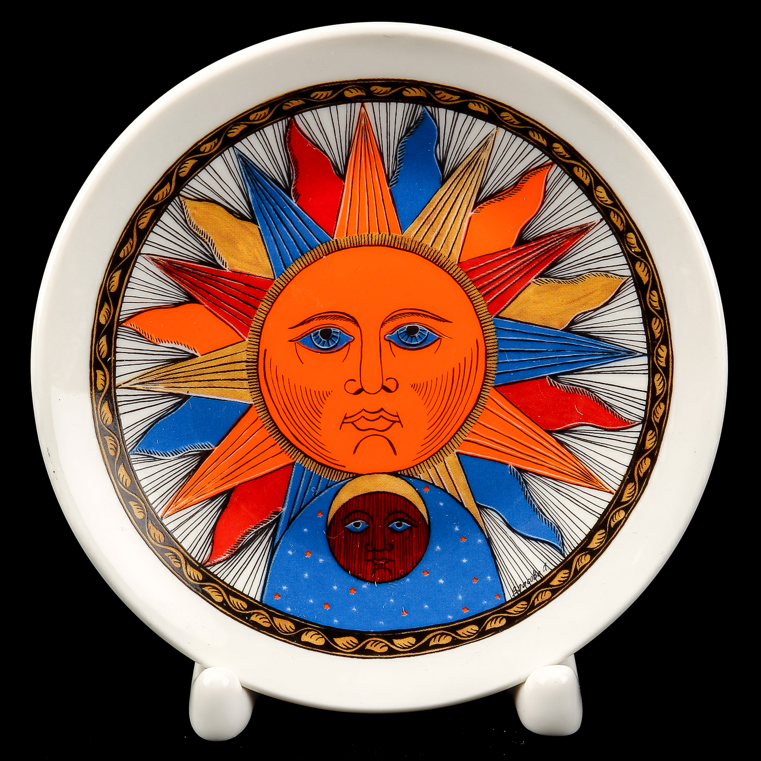 На тарелке изображен фрагмент известной гравюры «Солнце с Зодиаками». Это роспись потолка Парадных сеней деревянного дворца царя Алексея Михайловича в Коломенском под Москвой. Солнце и Луна с человеческими лицами, знаки Зодиака и четыре времени года служили тогда своеобразным календарем. Известно, что уже в XVII веке царские покои были украшены лубочными листами.