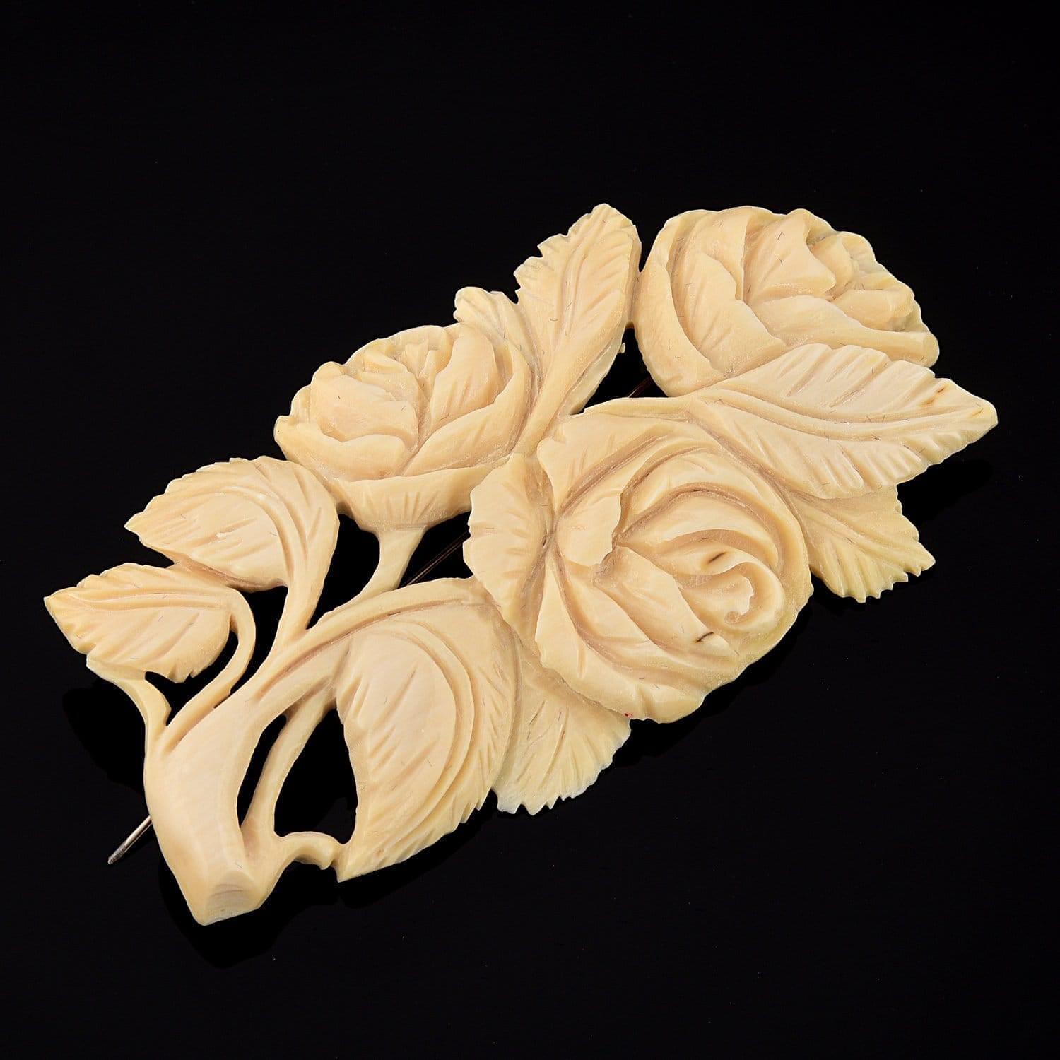 Брошь представляет штучный образец резьбы по кости. Привезена с Севера России. Сделана вручную из кости млекопитающего, исчезнувшего с лица Земли более 9000 лет назад. Бивень мамонта, согласно поверьям, передает обладателю силу и энергию огромного животного. Брошь в виде розы, символизирующей девственность, прекрасна! В суфийской поэзии роза как Божество и предмет любви противопоставлялась соловью как душе. В исламе роза олицетворяла святость и милосердие. Существует легенда, что имам Али перед смертью пожелал вдохнуть запах розы. Возможно так зародился образ пламенеющей розы в Божественной Комедии Данте (10 небо). К XIII веку относится появление розы в Западной Европе, что связано с крестовыми походами. В западной христианской традиции роза являлась символом Богородицы, хотя в Библии роза почти не упоминается.