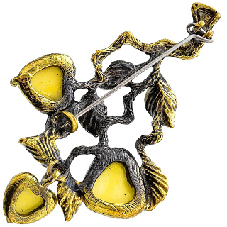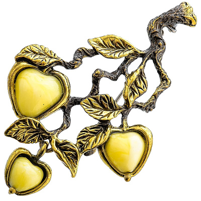 Брошь с янтарной вставкой «Яблочки на ветке» (белый)