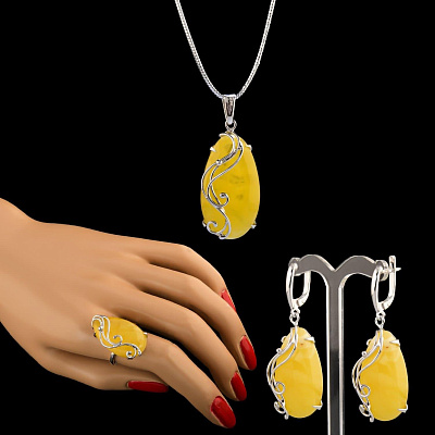 Вашему вниманию- тройка авторских украшений изготовлена из крупных элементов янтаря, которые оформлены из окаменевшей смолы хвои и идеально отшлифованы. Натуральный цвет янтаря подчеркивает оттенок кожи. При соприкосновении с ней янтарь заряжает тело энергией, накопленной за много тысяч лет.