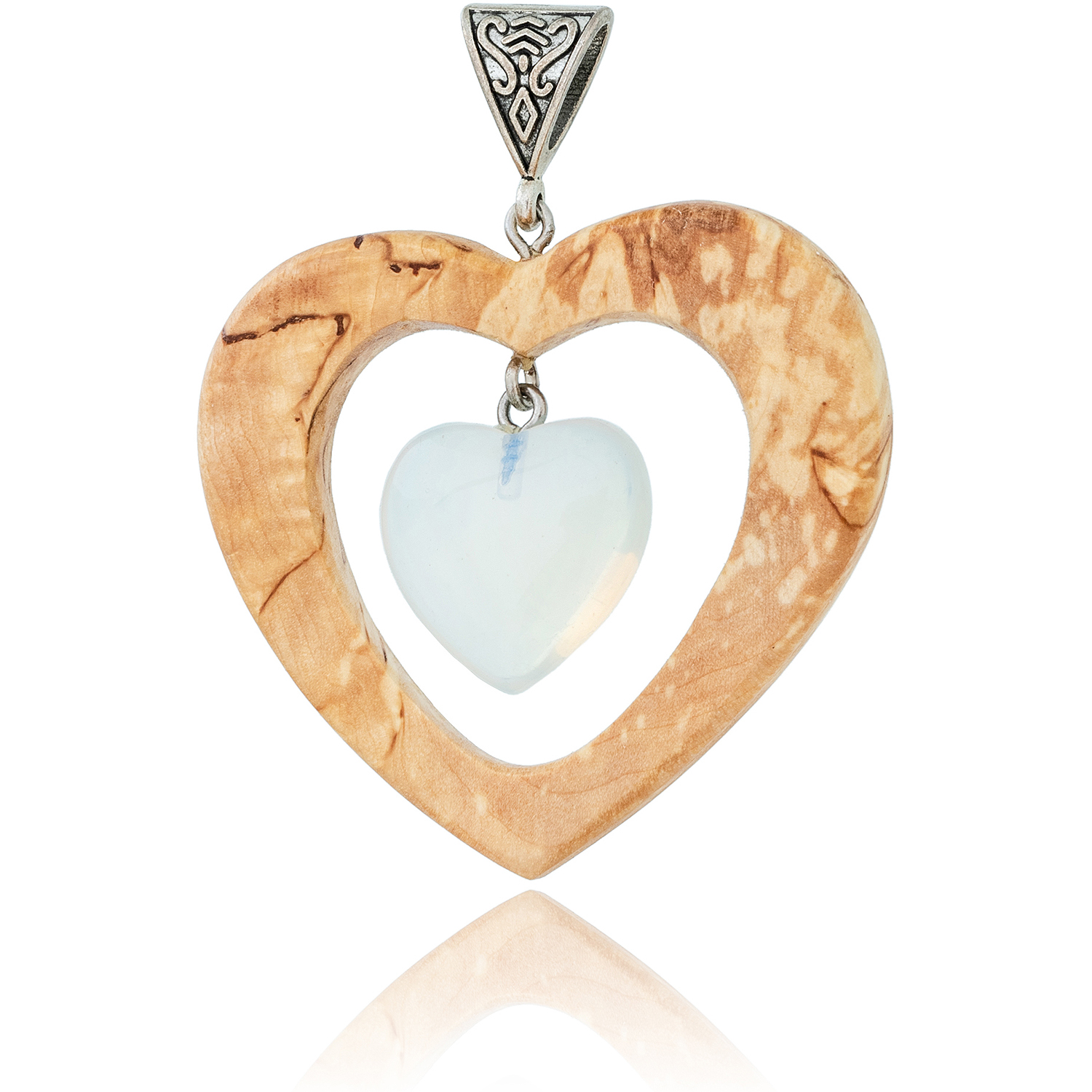 Кулон из карельской березы с лунным камнем "Два сердца".