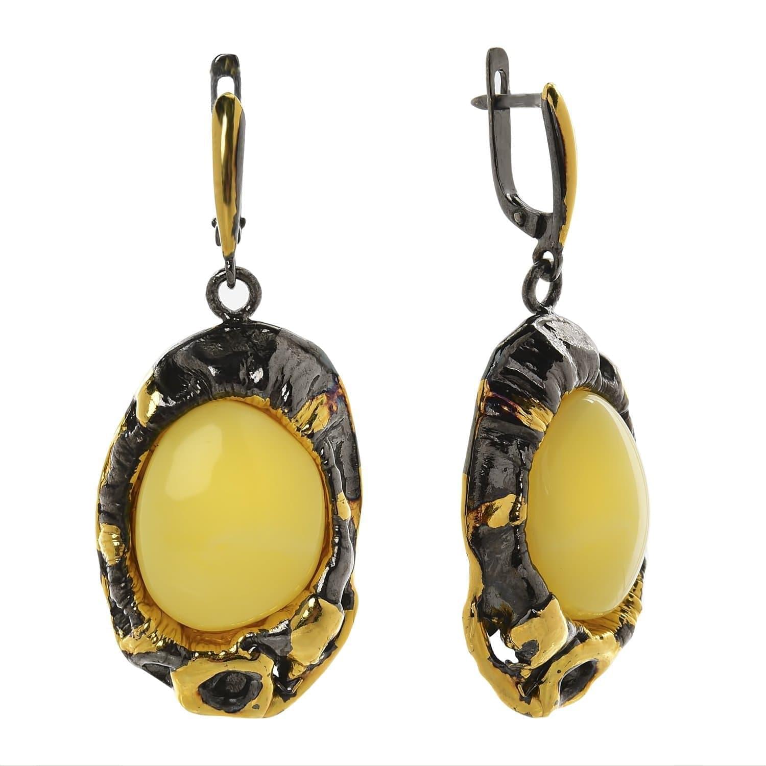 Дизайнерские серьги изготовлены российским ювелиром вручную из ценных поделочных материалов - солнечного балтийского янтаря (цельного, не прессованного) и драгоценного металла-самородка, серебра. Оправа частично украшена эффектной позолотой, подчеркивающей ванильный цвет и матовость натурального камня...
